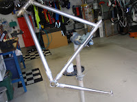 Trying to get as much done as possible before my birthday festivities begin and I take off for San Diego. I have both top points probably at 90% done. I like the side view. I wouldn't mind narrowing the taper on the rear point, but don't want it to disappear from the side. I won't shape the apron point until I can take a visual with the seat stays mocked up. It's got to look worthy of Dev and have flow.